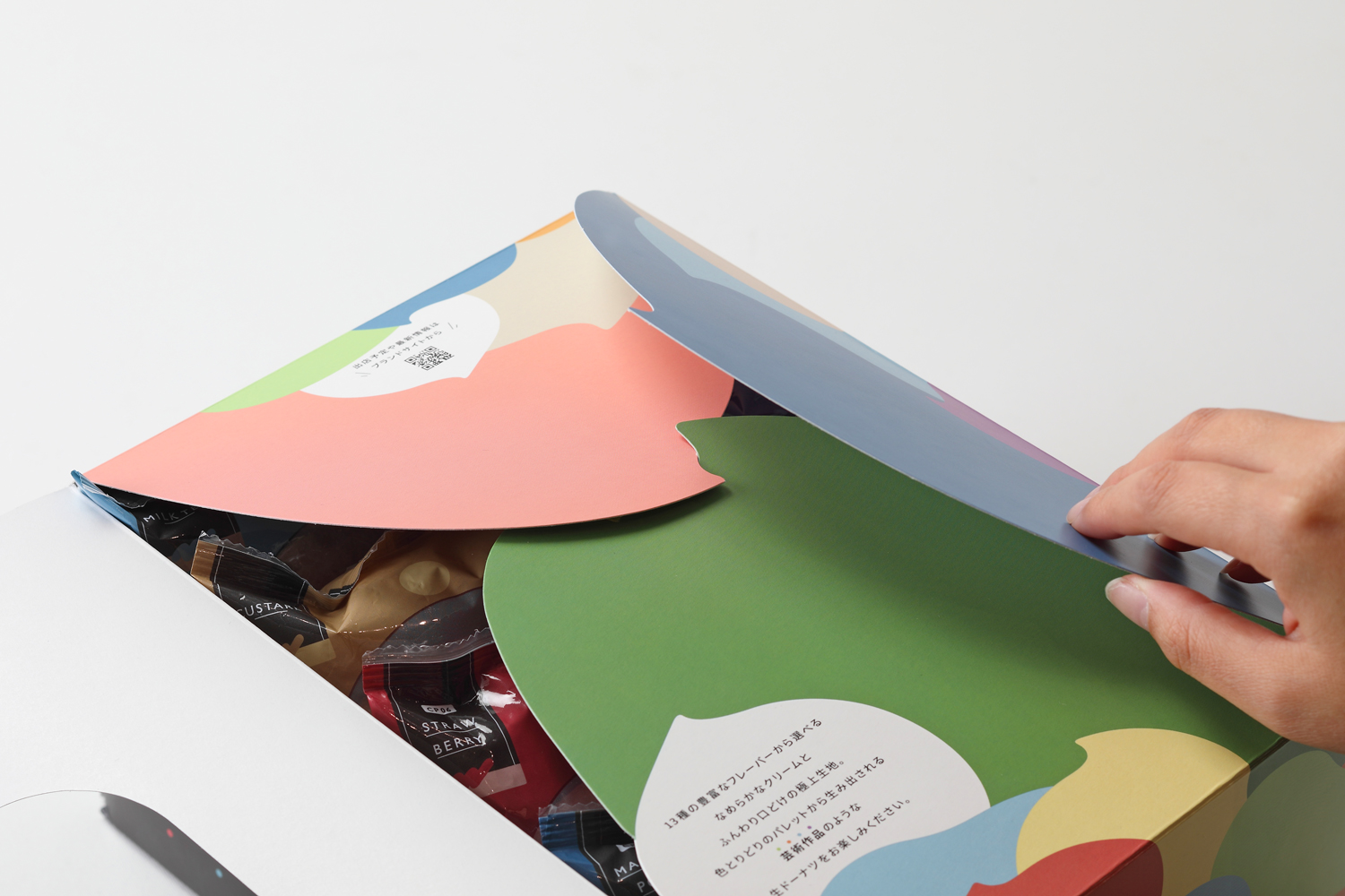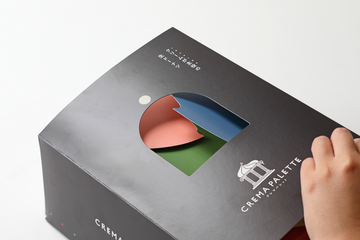 ガラスドーム型の穴の中に見える3色のデザインは、箱のフラップの重なりで表現しています!