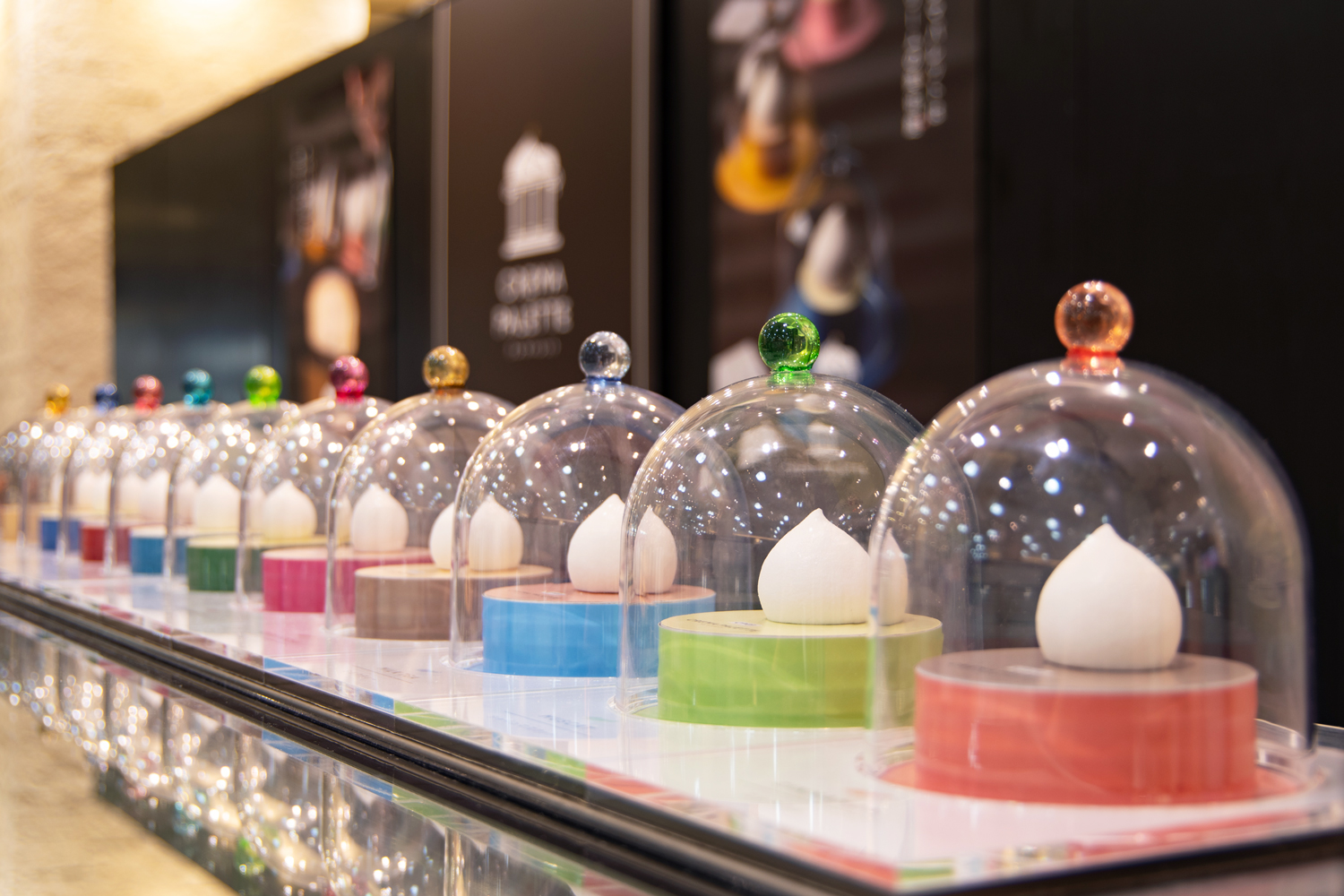 ガラスドームにそれぞれのフレーバーカラーとクリームを閉じ込めたアイキャッチは、催事会場でもひときわ目を引く存在に。