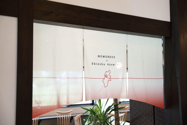 長野県安曇野市にある Laboratory NUMOROUS(ラボラトリー ニューモラス) のイートインスペースの暖簾です。